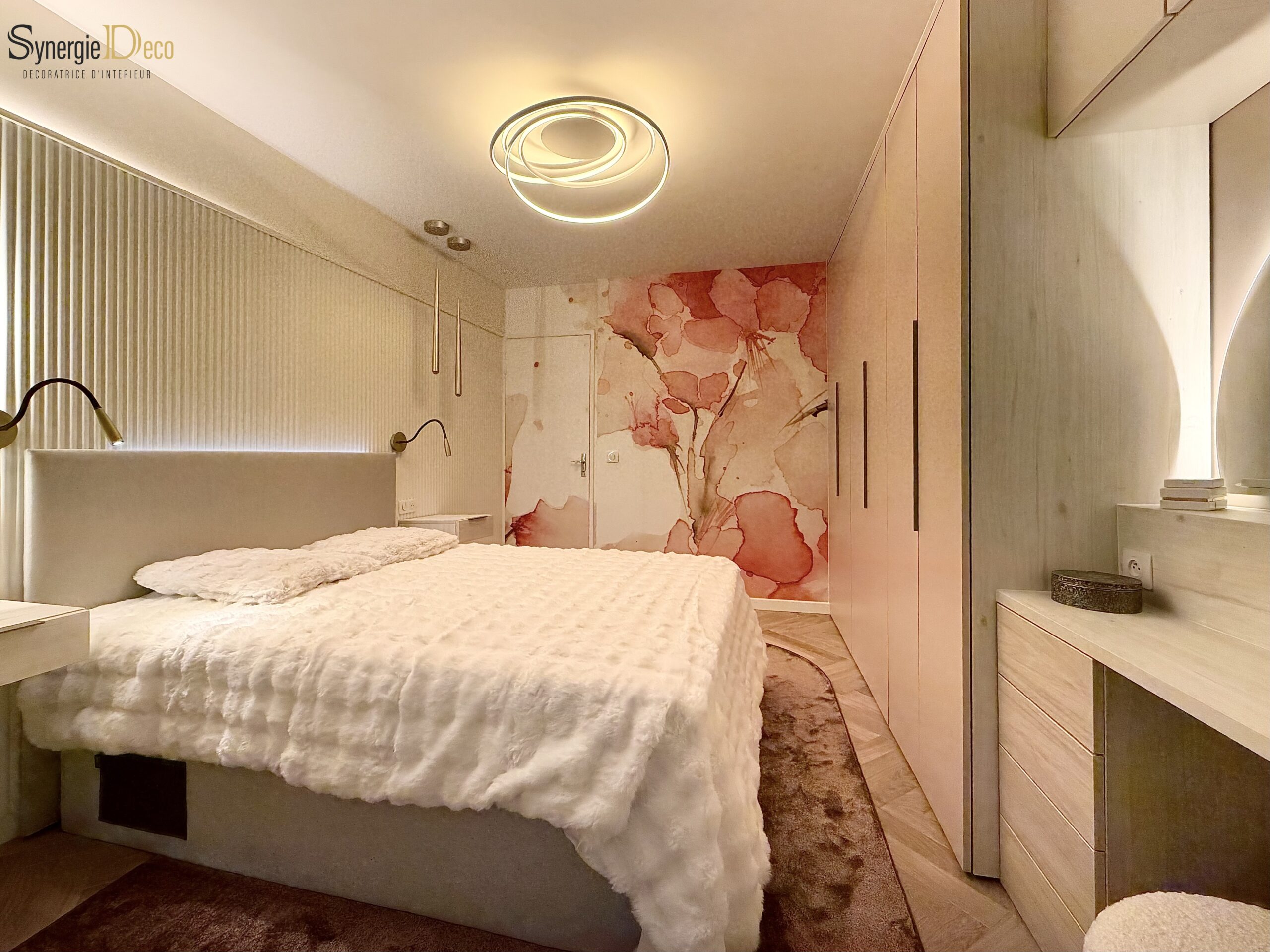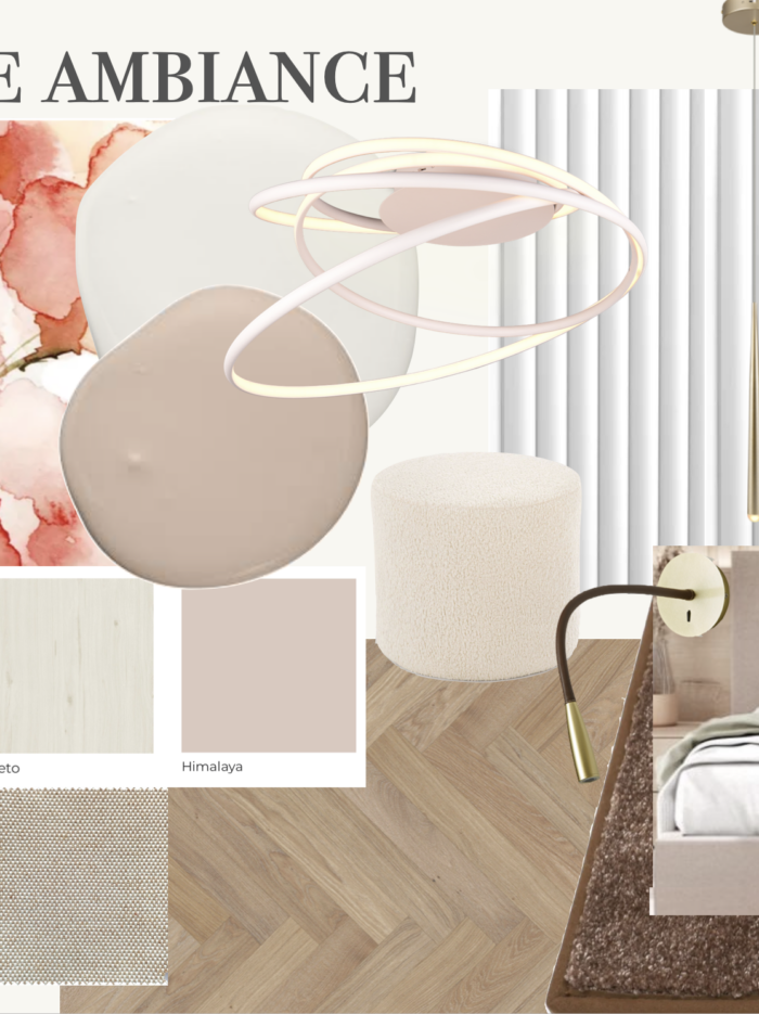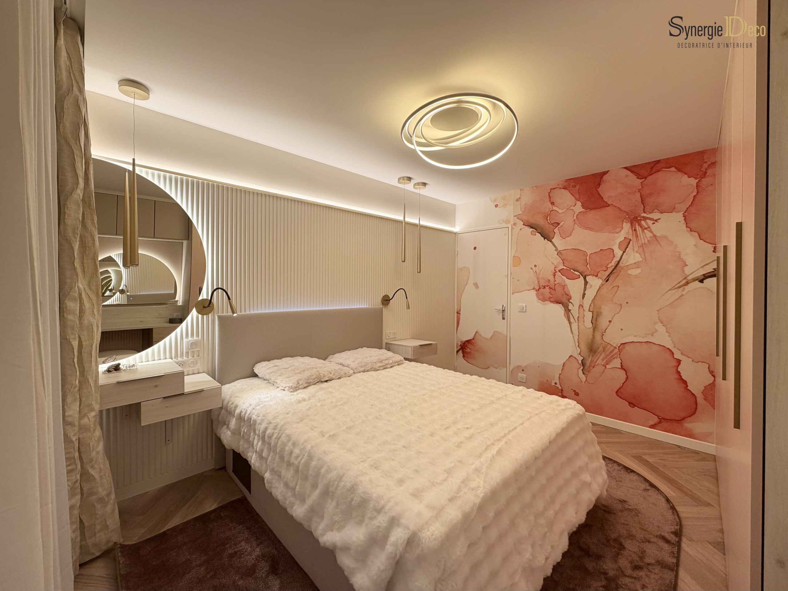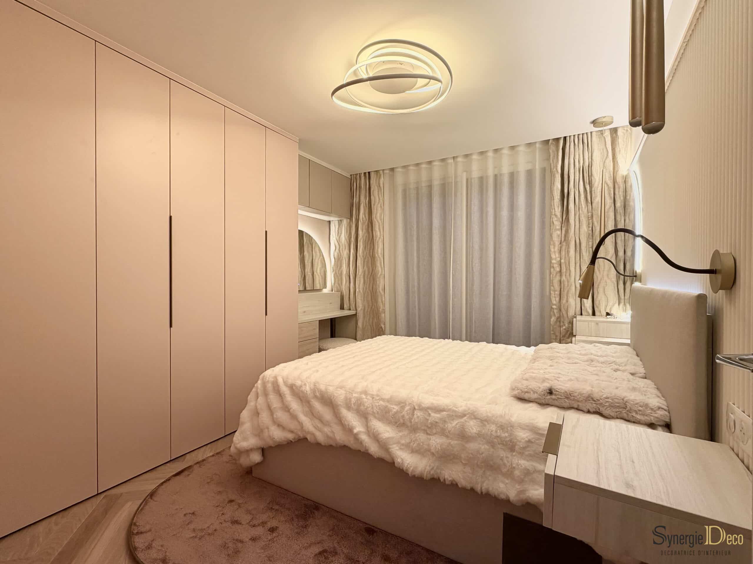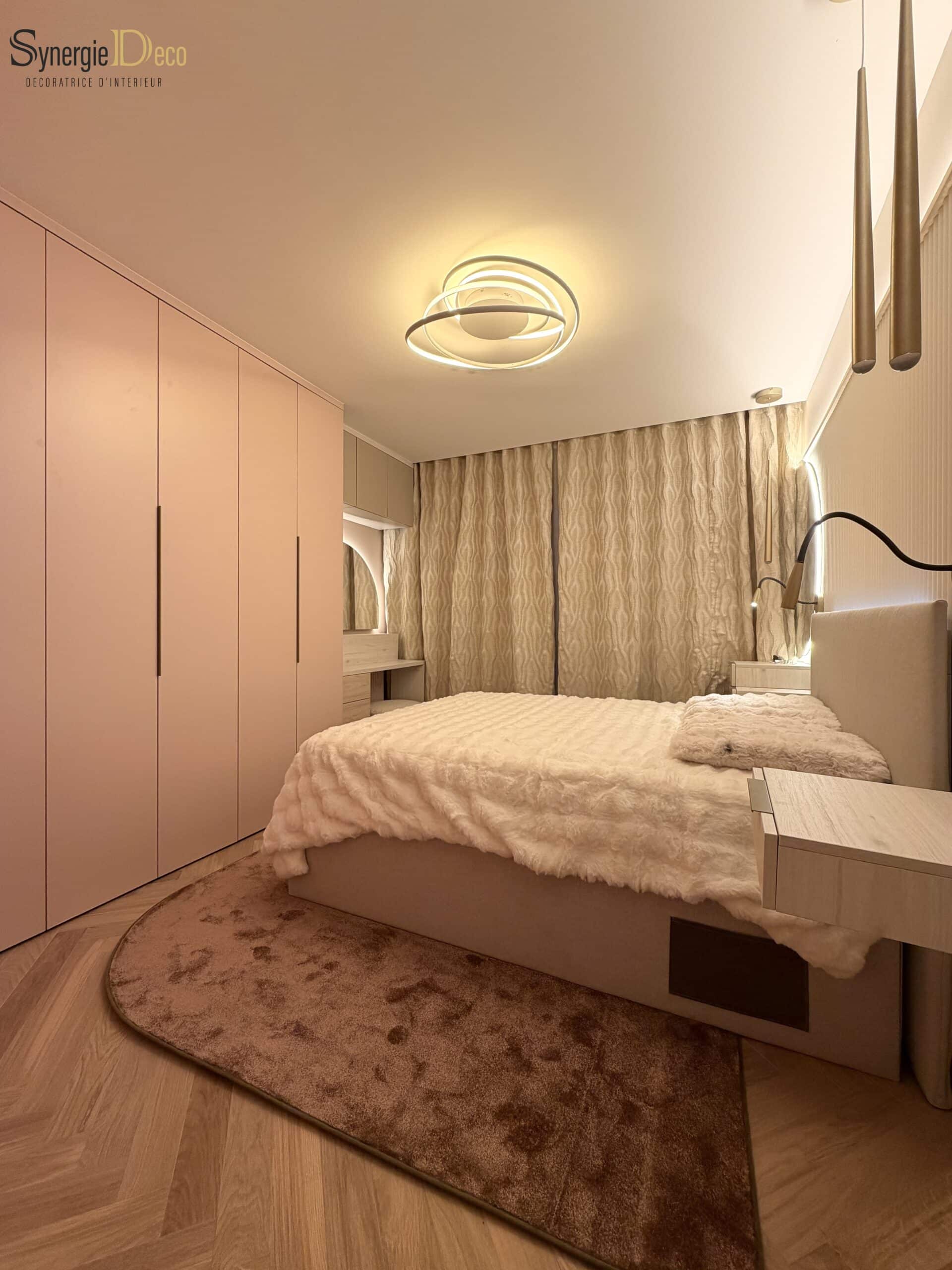 Ma mission m’a permis de proposer l’intégralité du mobilier: dressing sur mesure, lit, tête de lit et chevets , tapis, rideaux, luminaires, pouf . Un gain de temps et une facilité pour mes clients!