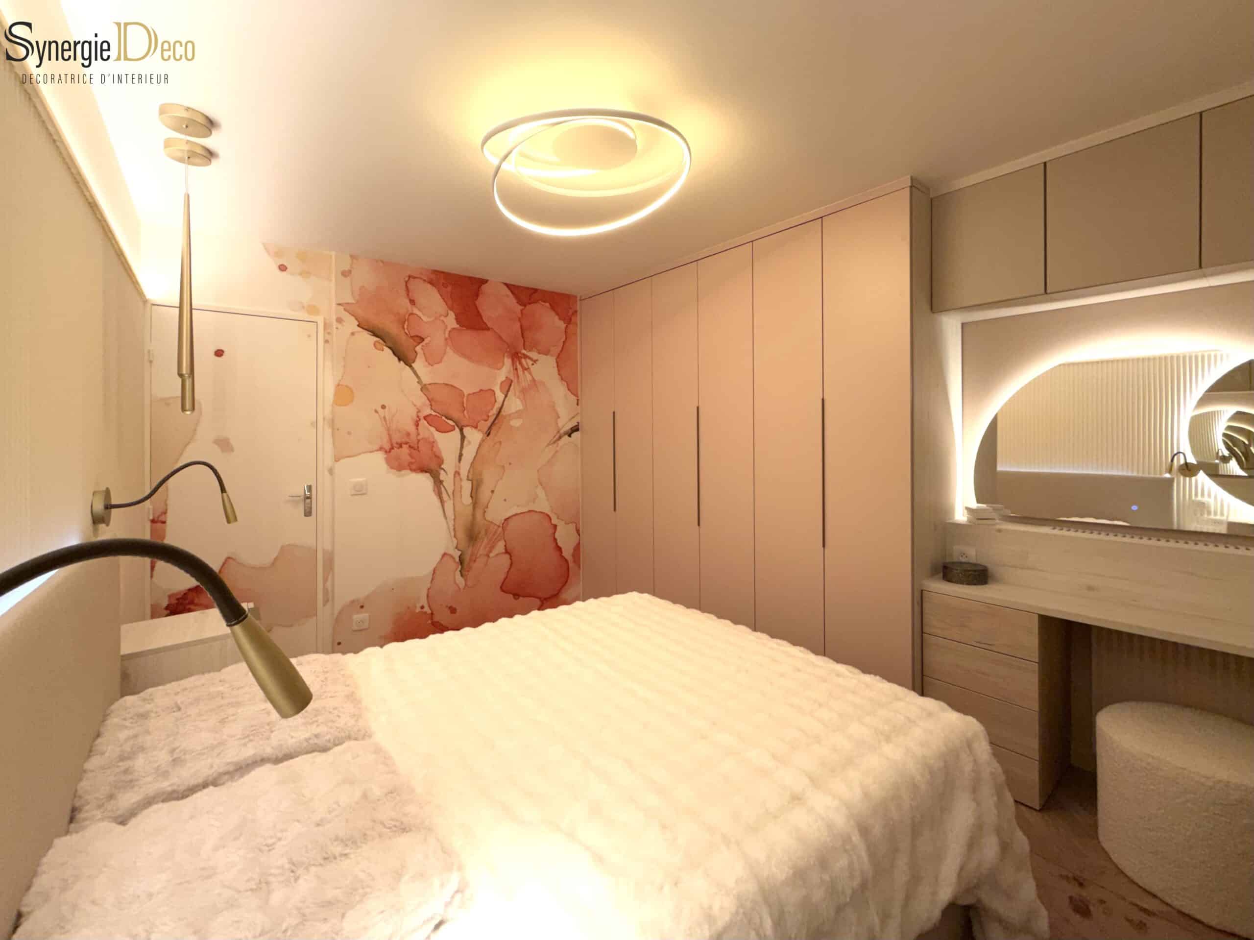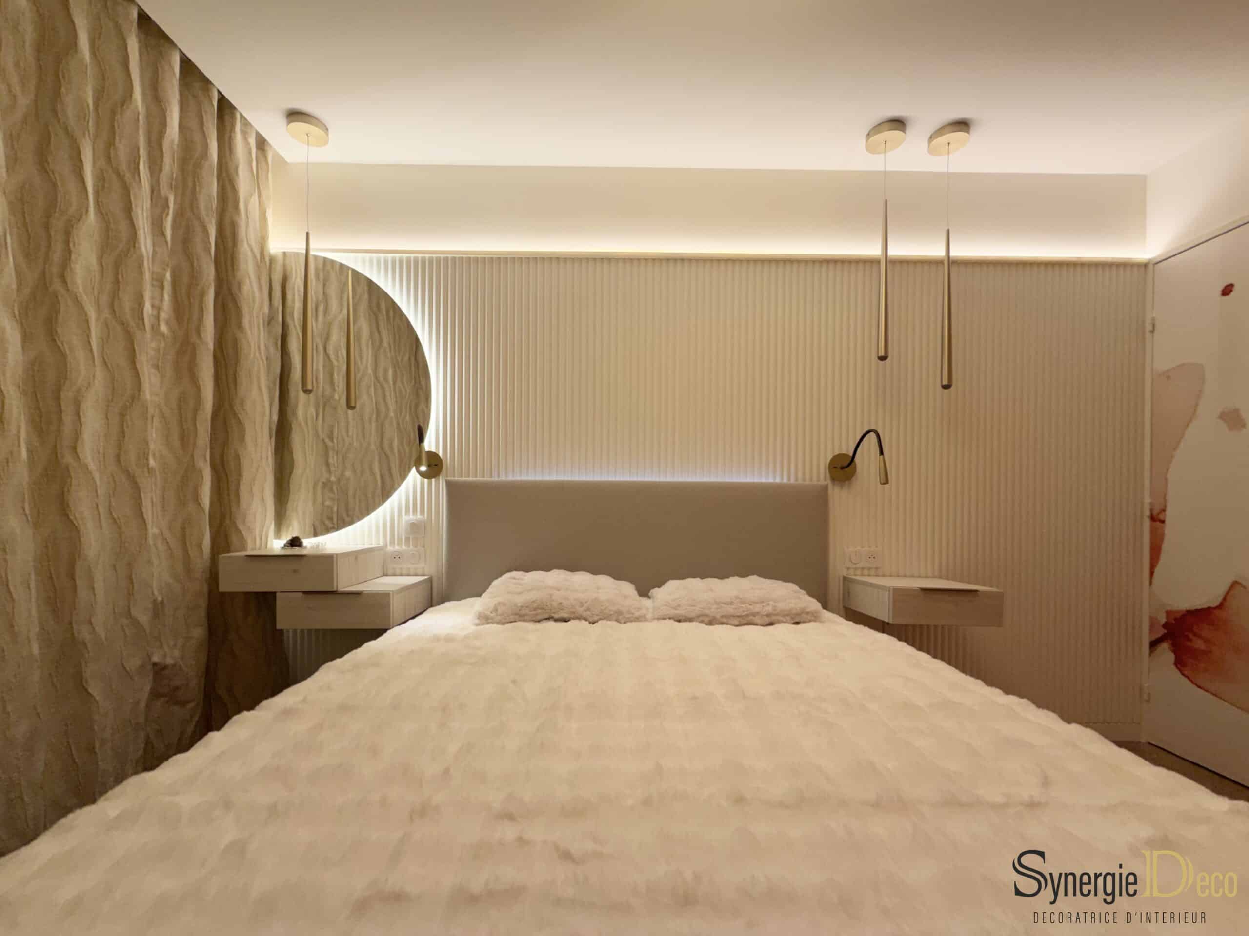 Le dressing de plus de 2,40 mètres, est donc toute hauteur: meilleure façon d’utiliser l’espace. Il bénéficie d’un éclairage intérieur. Un faux plafond a été créé pour apporter le point électrique central, mais également pour créer une « boîte » et cacher la tringle à rideaux . De jolis panneaux muraux ont été installés en tête de lit, avec un ruban lumineux. La tête de lit, déhoussable, se pare également d’un éclairage led. De chaque côté du lit, un chevet suspendu, animé par de belles suspensions, et des appliques liseuses articulées. Enfin, deux miroirs lumineux créent un trompe l’oeil intéressant.